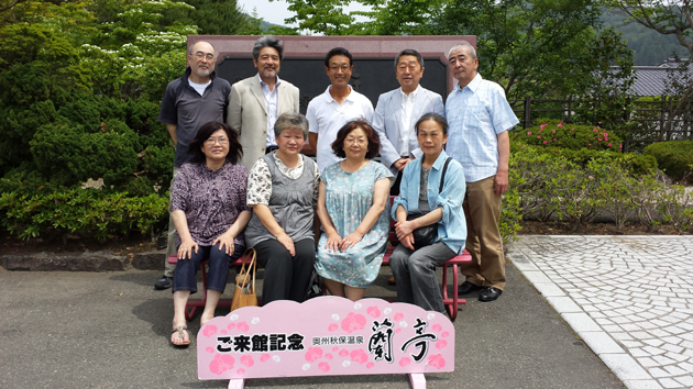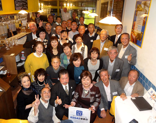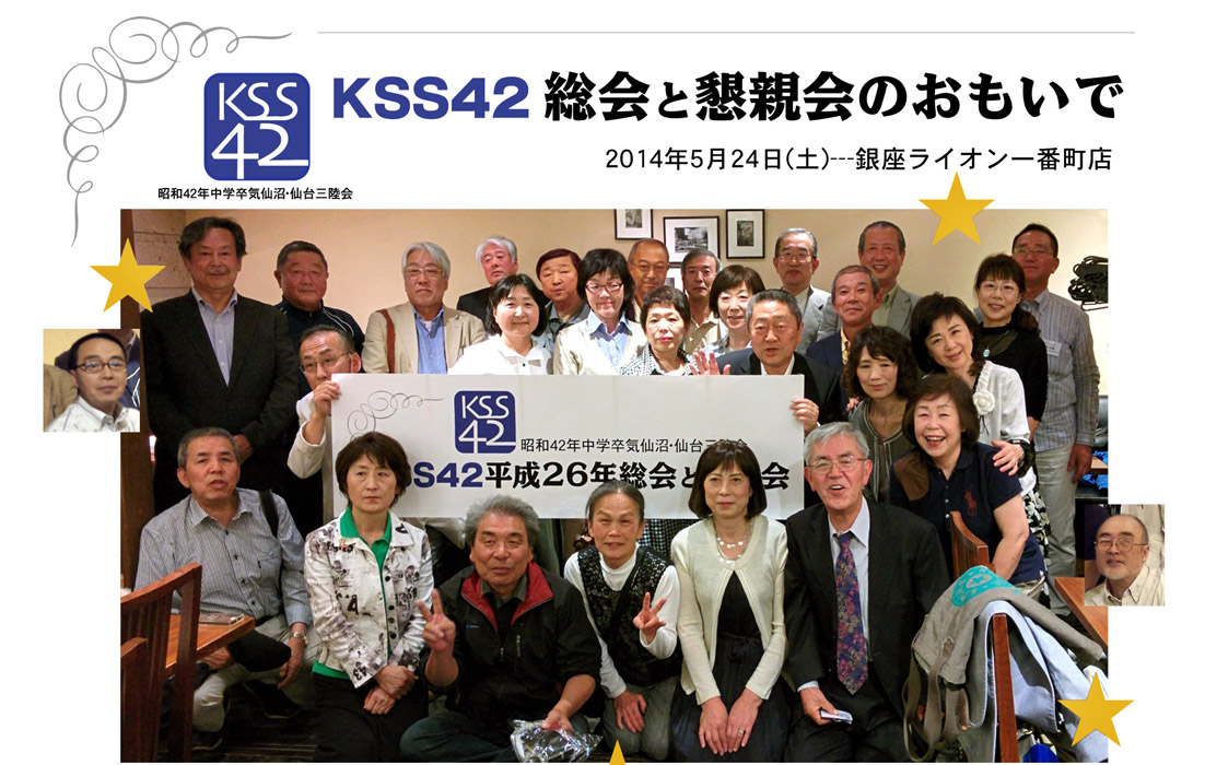 --------------------------------------------------- 平成26年6月2日・3日と気中3年3組のクラス会がありました。 奥州秋保温泉の「ホテル蘭亭」参加人数は9名 ![]() ▲写真右上から加藤公明くん、千葉正俊くん、斉藤謙一くん、鈴木徳一くん、 平野秀明、左下から高橋二美さん、小野寺英子さん、小山良子さん、 熊谷美和子さん(女性は旧姓のままでご紹介しました) 良子さん手作りの山菜料理や、まーちゃん持参のお酒で乾杯! いろいろな思い出話に花が咲き、懐かしいフォークソングで盛り上がり、 楽しいひと時は、あっという間でした。 そして皆さん元気で何よりです。 お世話役を務めていただいた 千葉君、小山さん大変ご苦労様でした。山菜料理美味しかったでした。 記:6月10日 ---------------------------------------------- ![]() 昨年10月以来、久しぶりに春の同年会/KSS42を 平成26年5月24日(土)に開催しました。 賑やかな一番町通りのビアホール(銀座ライオン一番町店)を会場に、 昼間12時から34名(男性23名、女性11名)の同年生が集いました。 まずは総会を開催し、 KSS42会則内容の説明と気仙沼への応援活動報告を行いましたが、 それはさっと終えて、肝心の懇親会。 出席者の紹介から始まって気仙沼の状況を黒田拓男君から話していただき、 アトラクションのビンゴゲームで(豪華商品ハワイ旅行券の噂は夢でしたが) 盛り上がりました。 また、気仙沼から、先日の市議会議員選挙で当選した 大島中学出身で気仙沼高校同窓の熊谷雅裕君が、 忙しいなか短時間でしたが出席してくれました。 飲み放題の宴会を終えてもまだ明るい昼間でしたが、 赤い顔をした高齢者のグループが、花の一番町通りを散歩し(徘徊かな?)、 2次会のカラオケでさらに盛り上がりました。 2次会が終わったのは6時近くでしたが、 さらに3次会まで進んだグループもありました。 よく飲み 歌い 話も尽きず、とにかく皆さん若いのには驚かされます。 本当に楽しい時間を過ごすことができました。 今度は秋に開催したいと思っています。 kss42:代表 記:5月28日 ---------------------------------------------- 「2014みやぎの書 60人展」 5月5日〜7日まで、せんだいメディアテーク5F 代表、小山達朗君に誘われ 気中3年9組の武山櫻子(美加)さんが出展している作品を拝見してきました。 ほか同級生の女性4名、 及川純子さん、斉藤しず子さん、小松秀子さん、大内礼子さん ![]() 忙しい中、武山櫻子さんはこころよく作品の前に立っていただきました。 「漁師カレンダー」とのコラボ 「海と生きる」の迫力のある書作品でした。 中国産の和紙6枚合わせ、下に小さいのを3枚に 墨の付け量、筆の配置、にじみの具合 流れをなどを計算して数点書いたうちの1作品だそうです。 説明をしていただき「書」の奥深さを実感しました。 明日は石巻でお仕事だそうです。 武山櫻子さんのすごいエネルギーに元気をいただきました。 そしてさすがに品のあるきれい方でした。 櫻子さんは名前のところの文章を、特にご紹介して下さい とのことでした。 …………………………………………… 震災で絶望に包まれていた気仙沼に、頼もしい漁船が戻った。 「海と生きる」気仙沼の漁師たちはとてつもなく頼もしくカッコいい! いのちをかけて「海と生きる」彼らは気仙沼を生き返らせる。 記:5月7日 -------------------------------------------