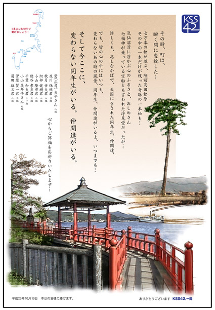 平成26年10月19日(日)仙台地区の同年会である KSS42秋の懇親会を開催しました。 イタリア料理店「デル・カピターノ」にて 参加者33名が、それぞれの近況や思い出を語り合いながら 楽しい時間を過ごすことができました。 会場には、先日突然の訃報が届いた 気仙沼の菊田雄三さん(気中3年8組)をはじめ 亡くなった同級生を偲ぶポスターを掲げ、哀悼の意を表しました。 仙台の花の一番町にあるイタリア料理店「デル・カピターノ」での懇親会。 お酒と美味しい料理を堪能しながら、賑やかに盛り上がりました。 ゲストとして迎えた 斎藤高史さん(同8組)の「アンチエイジング」をテーマにした話も、 皆さんが興味深く聞いていました。 斎藤さんは気仙沼で経営していたスポーツジムを、震災で被災した後、 仙台市近郊の利府町に移しました。 専門テーマである健康と身体づくりについて講演していただきました。 私も日頃の運動不足と食生活改善の必要を実感しました。 皆さんも大いに参考になったようです。 春の総会以来の集まりでしたが、3名の方が今回はじめて参加するなど、 着実に参加者が増えております。 これからもこの楽しい会を続けていきたいと改めて思った次第です。 KSS42幹事一同 代表 小山達朗 ![]() ▲店内を広くして頂き皆さん集合。撮影はオーナーです。 秋の懇親会 10月19日に開催する数日前に 雄三君の訃報を知り、すごいショック受けました。 自分に何かできないのかと、その日の夜ずーっと思案しました。 前日の午前中にアイデアが膨れ上がり、一気に仕上げた作品です。 何か、亡くなった雄三君や皆のパワーを感じて 出来上がったような不思議な感じでした。 今後の懇親会には、故郷や同級生、仲間たちに起こった出来事を 自分なりに、下記のような作品で表現出来ればと考えております。 ![]() 記:10月24日 ●小田明紀氏のブログ ●当幹事 小松亀一氏のサイト ---------------------------------------------------