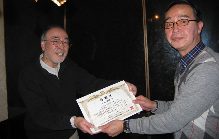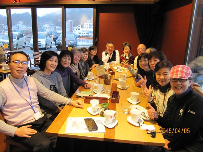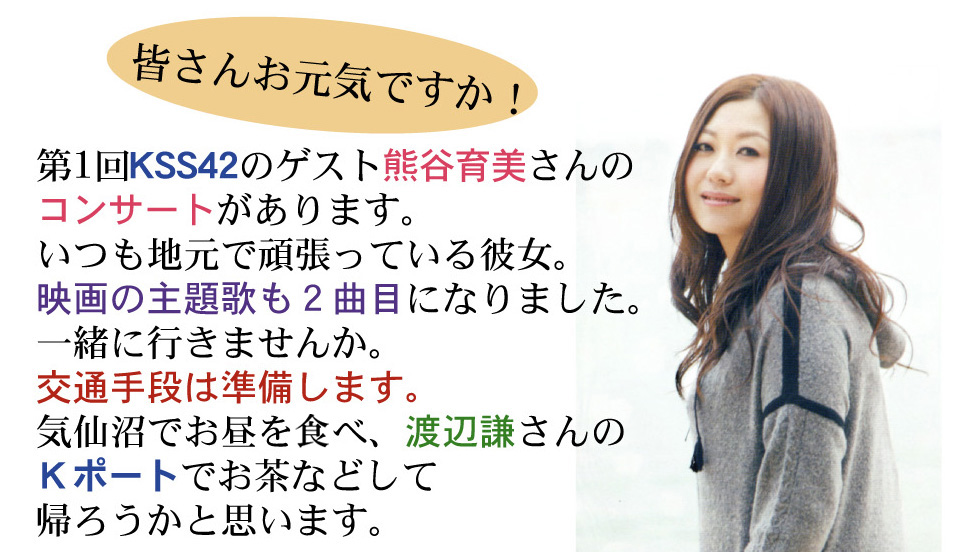 ------------------------------------------ 平成27年5月16日(土)午前11時30分 仙台では、朝からの小雨もあがり 第31回仙台・青葉まつりが始まりました。 街は賑やかになってきたころ 一番町店の銀座ライオンビヤホールでは、 KSS42第2回定期総会と第4回懇親会が開催されました。 参加者が予想以上に増えて、北は盛岡、気仙沼、南は東京方面、 仙台近辺の合計で45名もの同年生たちが集まって頂きました。 総合司会の矢嵜さんの進行で始まり、代表の小山さんの開会の挨拶、 正俊さんの総会の報告も無事終わり、懇親会は、壽さんの乾杯で始まり、 進行役の正俊さん、しず子さんの、巧みな進行で盛り上がってきた頃に 代表者3名のすばらしいスピーチ。 徳一さんの「今日は感謝の意味も含め、恒四郎をつれて来ました〜!」で 皆すごい大盛り上がり。真人さん、小春さんのスピーチも無事終了。 スピーチありがとうございました〜! 次はゲームアトラクションのビンゴゲームとジャイケンゲームなんと 賞品は純子さん手作りの素敵な織物が全員に渡されました。 純子さんは 日本生涯学習協議会日本染織協議会認定手織り技術者です。 いつも本当にありがとうございます。 また、ゲームをさらに盛り上げていただきました美加さん 素敵な大声で大変助かりました。ありがとうございます。 2時ごろ修二さんの終宴の〆で解散の前に皆で記念撮影 この時間は唯一僕の腕の見せ所、いいアングルが決まったところで 小山代表が「ケーィエスエスヨンジュ〜ニ〜〜ッ!!」で 皆素敵な笑顔になりました。 二次会は国分町「レモンカントリー」へ出発!! 皆さん今回も元気でなによりでした。 三次会は「カラオケ」でまた盛り上がったとか… ![]() 画像クリックで拡大 記:5月22日 ------------------------------------------ 熊谷育美さん--気仙沼コンサートツアー 4月5日、雨の降る日でしたが仙台から幹事6名で 気仙沼に向かいました。 ![]() 満員の市民会館で、 一流ミュージシャンの演奏をバックにした育美さんの歌は 魅力にあふれ、カッコイイとしか言えません。 本当に最高のライブを楽しむことができました。 会場には気仙沼の同級生の吉田恵子さん(3年8組)、林小春さん(2組)、 昆野牧恵さん(11組)、高田登喜子さん(5組)、高橋二三さん(3組)、 植木実君(9組)、武山美加さん(9組)、小野寺英子さん(3組)、 千葉恵子さん(2組)、斉藤みゆきさん(6組)、小山澄子(7組)さんなど 沢山の同級生が来ていました。 なかでも吉田恵子さんは 今回のライブの実行委員長としてサポート活動をしており、 チケットが完売にいたるまで、どれだけの努力をしたのかと頭が下がります。 恵子さん本当にお疲れ様でした。 ![]() ライブが終了し、俳優の渡辺謙さんがつくったカフエ「K-port」に移動し、 総勢14名(仙台から6人、気仙沼から8人)で ピザとパンケーキでお茶こ飲み(お茶会)をしました。 あまりの盛り上がりに 他のお客さんにご迷惑をおかけしたのではと、 後から心配になりました。 天気の悪い一日でしたが、 楽しい同級会と素敵なライブ演奏を楽しむことができました。 本当に良い一日を過ごせた気がしています。 ヤッパリ、故郷気仙沼は 明るく元気な同級生が暖かく迎えてくれる場所です。 同級生の皆さんありがとう。楽しかった!! 記:小山KSS42代表 記:4月9日 ------------------------------------------ 平成26年3月4日に亡くなられた同級生 熊谷孝良君(気中3年3組)の娘さんのコンサート 熊谷育美コンサート2015「PROCEED」 地元気仙沼市民会館で4月5日(日)開催されます。 今までKSS42の懇親会に来ていただいた同級生に お知らせと、お誘いの葉書を送りました。 ![]() ![]() 「きっときっと、お父さんも来てくれるでしょう」 ●チケット詳細はkumagai193.com まで 記:2月27日 ------------------------------------------ 今年も気仙沼から、ひかりの柱をたちあげつづける 「3月11日からのヒカリ」プロジェクト開催 ![]() photo by Hatsuzawa 18:30〜24:00まで 気仙沼市内湾から鎮魂・希望・感謝の思いをこめて 3本のひかりをたちあげます。 サイトのトップ縦文字の最後には 「ふと、見上げた夜空に、たちあがる光は 私たちの心に記憶を刻み これから進む未来へ明かりを届ける 灯火になってほしいと思います」 とありました… 3月11日からのヒカリ・プロジェクト 記:2月27日 ------------------------------------------ 第1回-感謝状贈呈プロジェクト 去年12月11日KSS42メンバー数人で忘年会があり、その後2次会があり、 3次会で達朗君、正俊君の3人になりました。 その時に、時々小田君のブログの話題が出ました。 明ちゃんはいつも、いい記事を載せてくれて頑張っているなぁ、 ほぼ毎日だよ。とか KSS42も随分掲載して頂き、お世話になったね。などと それで今年の締めくくりとしまして、eメール添付になりますが 感謝状をKSS42より送ったらいががでしょうかと、提案しました。 小山会長と正俊君、平野との3名で意気投合しました 本当は、お酒の勢いもありましたが「感謝状」の添付贈呈を提案しました。 でも僕達だけでは、大変おこ