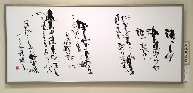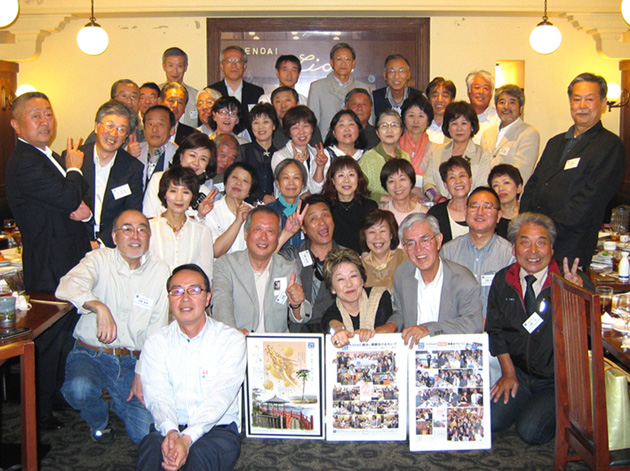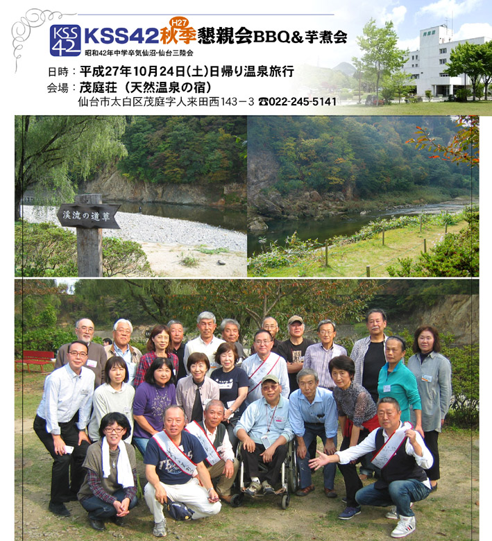 ------------------------------------------ ![]() 平成27年10月24日(土) KSS42恒例-秋の懇親会を開催しました。 仙台市内のホテル茂庭荘中庭を会場に25名の同年生が集まり 芋煮会・バーベキューと温泉を楽しみました。 当日は三浦清安君(気中3年11組)が初めて参加し、中学卒業以来の再会になりました。 清安君は車椅子での参加になりましたが、再会に会話が弾み改めて 同年生の優しさと親しみを実感した素敵な一日でした。 また当日、残念ながら都合で参加できなかった方や、 ご家族の方からも沢山の差し入れを頂戴いたしましたので、ご紹介します。 ・植木実君(9組)からは「気仙沼さんま昆布巻き」、 ・盛岡の佐藤律子さん(3組)からは「果物」を、 ・大竹純子さん(4組)のご子息から「お酒」を、 ・杉山秀子さん(11組)のお姉さまから美味しい「お団子」、 ・阿部純子さん(8組)からは「お新香」を、 ・菊田裕美君(1組)は埼玉の「銘菓」を手土産に東京から参加してくれました。 みんな、とても美味しくいただきました。 KSS42は同年生だけではなく、そのご家族にも支えていただいていることに あらためて感動を覚えました。本当にありがとうございました! 周囲には他のグループの方々が沢山いましたが、 お酒とじゃいけん(ジャンケン)ゲームで賑やかに盛り上がり 一番騒がしいグループではなかったかと、後から心配になりました。 本当に楽しい時間を賑やかに過ごすことができました。 また、役員の皆様のご活躍にも心から感謝です。 バスで仙台駅に戻り、二次会はカラオケで大いに盛り上がり 次回の再会を誓い散会となりました。 記:代表 記:11月3日 ![]() ●画像クリックで拡大 ------------------------------------------ 吉報です! 気中3年9組の武山櫻子(美加)さんが 第62回河北書道展の第4部近代詩文に みごと、「東北放送賞」に選ばれました。 美加さん、おめでとうございます。 ![]() ![]() 『水平線』 「決っして海を見ていた訳でもない だからと言って空を見ていた訳でもない かぎりなく交わることのない空と海 そのあいだに過去と未来がぼんやり見えるような気がした水平線」 と書いています。 ●授賞の感想は〜もちろん、 地元での授賞なので、中央展とは違った嬉しさが有ります! 皆さんに観て頂けるから(^_^)/櫻子さんよりeメール ●題材の詩は風景が目に浮かぶようで、 気に入ってました。 情景が見えるような作品にしようと書きました。 16年前から毎年出品して、入賞は初めてです。 本当にびっくりしてます。 これからも自分らしい作品を作って生きたいです。 気仙沼市・書道教室主宰 (27年8月13日河北新聞より) 記:8月18日 ------------------------------------------