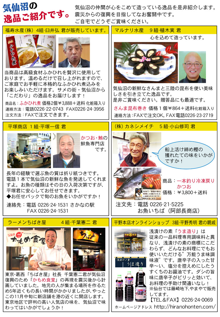 27年恒例の忘年会と感謝状贈呈 ![]() ![]() ※画像クリックで楽しい様子と感謝状を見れます 12月10日(木)18時〜20時より田中や本店にて 「皆さま先日は楽しい懇親会をありがとうございました。」と 小山代表のご挨拶で、始まりました。 参加人数は 小山、大竹、熊谷、佐々木、斎藤、杉山、 高橋、千葉、新沼、平野、畠山の11名 盛り上がったところで感謝状贈呈のサプライズ 記:12月12日 ------------------------------------------ 気仙沼の味「かもめ食堂」が復活しました! ![]() 気仙沼の味「かもめ食堂」復活! 朝日新聞記事を小山代表が送ってくれました。 「震災前の活気ある港町になってほしい」 それは、気仙沼人、誰もが思う気持ちです。 憲二君が語ると気仙沼の明るい未来が そう遠くはないように思えて 元気がでますね。 千葉憲二君念願の開店おめでとうございます。 記:12月9日 ------------------------------------------